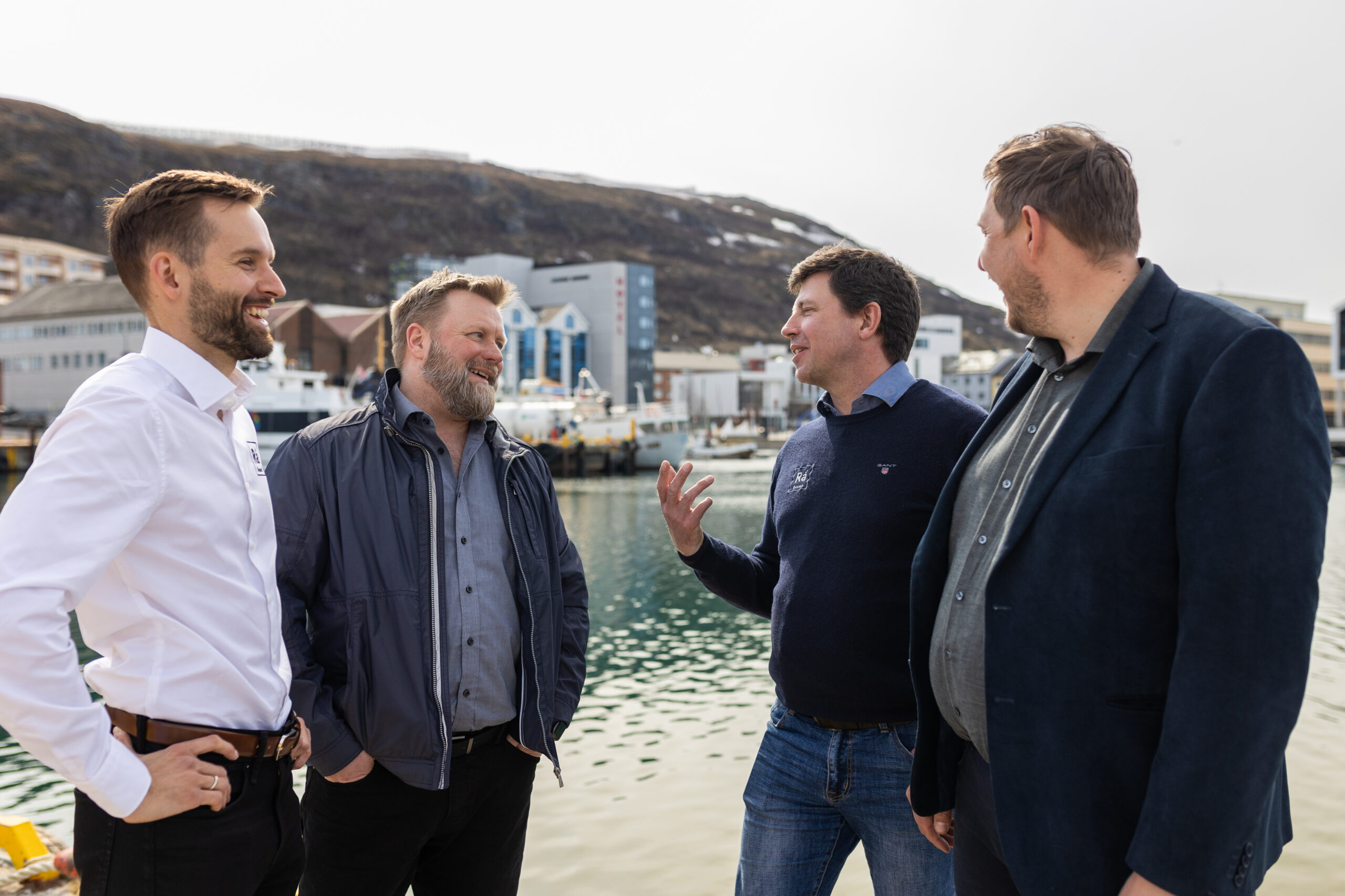 Smilet satt løst på kaikanten i Hammerfest da intensjonsavtalen om salg og distribusjon av biogass ble undertegnet. Fra venstre daglig leder Sigve Daae Rasmussen i Rå Biopark, kvalitetsleder Stig Ove Hjelmevoll i Barents NaturGass, teknisk sjef Simon Ford i Rå Biopark og salgssjef Mikael Rikstad Iversen i Barents NaturGass.